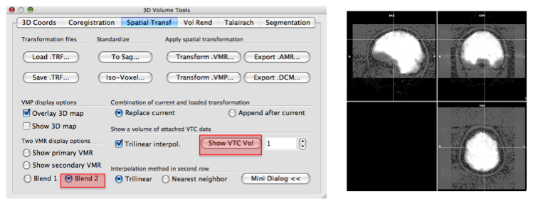 - On the "3D Volume Tools" dialogue, choose "Spatial Transf" and press "Show VTC Vol" and after a while, you will see the image aligned epi image.